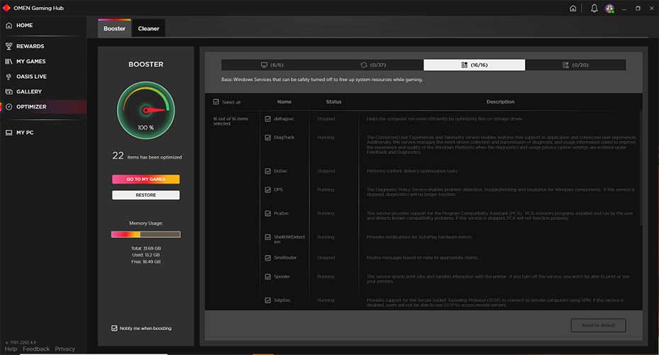Τόσο οι φορητοί υπολογιστές OMEN 16 όσο και οι φορητοί υπολογιστές Victus 15 διατίθενται με προεγκατεστημένο το OMEN Gaming Hub για να επωφεληθούν από ισχυρές εσωτερικές λειτουργίες, όπως η Λειτουργία απόδοσης, το Network Booster και το System Vitals για να βοηθήσουν τα παιχνίδια να λειτουργούν. Η νέα δυνατότητα Optimizer προχωράει ακόμη περισσότερο, επιτρέποντας στους λάτρεις να ελευθερώσουν πόρους του συστήματος και να τροποποιήσουν τις ρυθμίσεις του λειτουργικού συστήματος χαμηλού επιπέδου για να μεγιστοποιήσουν τα FPS ανεξάρτητα από το αν ο υπολογιστής τους είναι OMEN, Vitus, προσαρμοσμένος ή άλλος. Επιπλέον, η πρόσβαση σε άλλες λειτουργίες όπως Gallery, Rewards, Oasis Live και OMEN Light Studio με υποστήριξη για τα φώτα Twinkly αυξάνει τις εμπειρίες παιχνιδιού με νέους και συναρπαστικούς τρόπους.