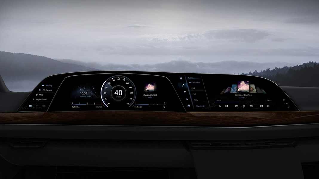 Είναι η πρώτη φορά που η τεχνολογία P-OLED cockpit που χρησιμοποιεί η νέα Cadillac Escalade του 2021εμφανίζεται σε όχημα ιδιωτικής χρήσης. Το σύστημα περιλαμβάνει οθόνη 38 ιντσών με τρεις αυτόνομες P-ΟLED οθόνες, η μεγαλύτερη εκ των οποίων είναι 16,9 ίντσες. Οι τρεις κυρτές οθόνες συνθέτουν το Instrument Panel Cluster για την εμφάνιση βασικών πληροφοριών σχετικά με τη λειτουργία του οχήματος, καθώς και το Integrated Central Stack, που χρησιμεύει ως οθόνη πληροφοριών ψυχαγωγίας για περιεχόμενο ήχου, video και εύκολης πλόηγησης. Το φουτουριστικό και ολοκληρωμένο σύστημα οθονών της LG προσφέρει ασύγκριτο σχεδιασμό, ευρεία γωνία θέασης και αναβαθμισμένο περιβάλλον χρήσης.