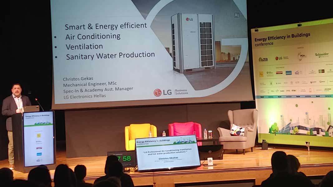 Έχοντας δυναμική παρουσία στο συνέδριο, η LG Business Solution παρουσίασε τη γκάμα των προηγμένων λύσεων κλιματισμού και θέρμανσης, οι οποίες είναι σχεδιασμένες για να είναι φιλικές προς το περιβάλλον και ενεργειακά αποδοτικές. Συγκεκριμένα, ο κ. Χρήστος Γκέκας, Μηχανολόγος Μηχανικός ΕΜΠ, MSc, AE Academy Asst. Manager της LG Electronics, παρουσίασε τις λύσεις κλιματισμού και θέρμανσης της εταιρείας στην ενότητα «Καλές πρακτικές βελτιστοποίησης της ενεργειακής απόδοσης σε κτιριακές εγκαταστάσεις και υποδομές», τονίζοντας την ευελιξία και την υψηλή αποδοτικότητά που διασφαλίζουν τα προϊόντα της LG.