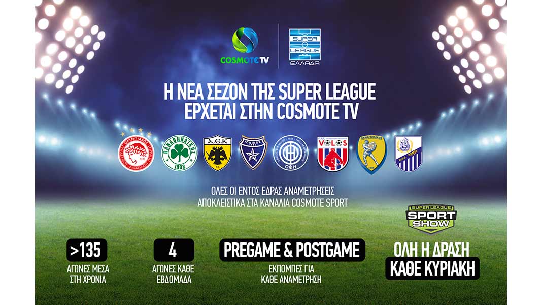 Η νέα σεζόν του Πρωταθλήματος Super League έρχεται στην COSMOTE TV, με 4 αγώνες κάθε εβδομάδα στην κανονική περίοδο και περισσότερους από 135 συνολικά, μέχρι την ανάδειξη της νέας πρωταθλήτριας ομάδας. Οι συνδρομητές θα απολαμβάνουν ζωντανά και αποκλειστικά από τα κανάλια COSMOTE SPORT όλες τις εντός έδρας αναμετρήσεις του Ολυμπιακού, του Παναθηναϊκού, της ΑΕΚ, του Ιωνικού, του ΟΦΗ, του Βόλου ΝΠΣ, του Παναιτωλικού και του ΠΑΣ Λαμία.