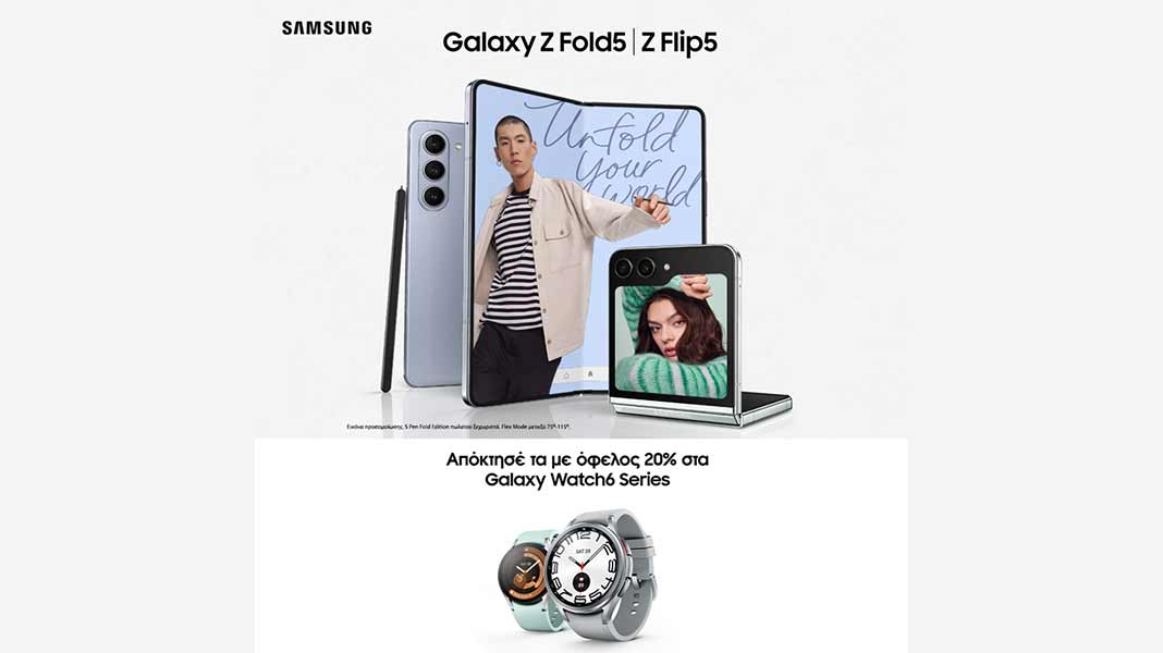 • Με κάθε Samsung Galaxy Z Flip5 και Samsung Galaxy Z Fold5, 20% όφελος στα Galaxy Watch6 Series