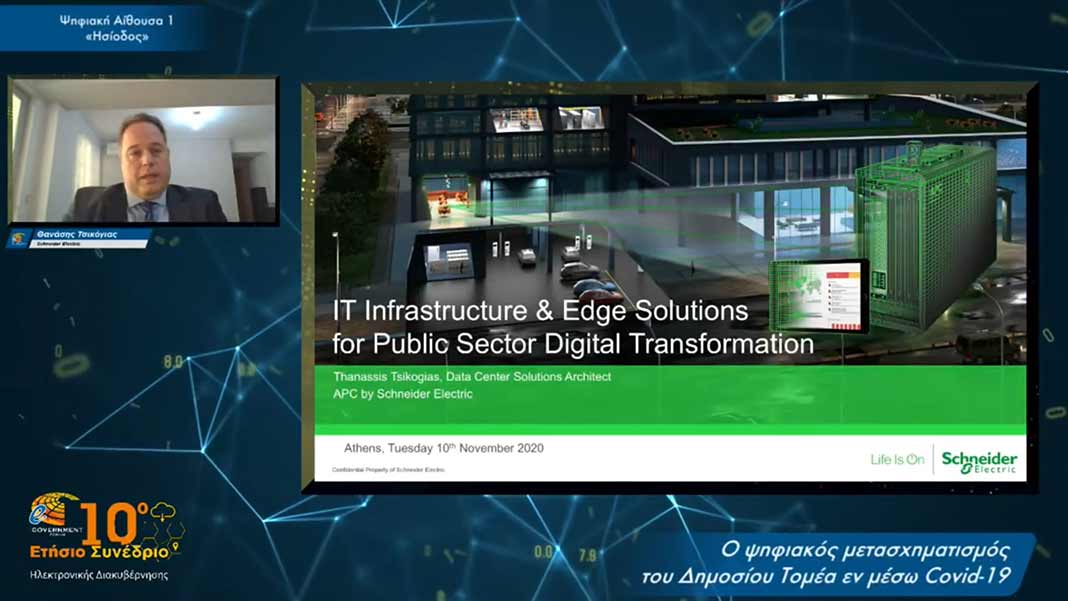 Η Schneider Electric, πρωτοπόρος στον ψηφιακό μετασχηματισμό της διαχείρισης ενέργειας και του αυτοματισμού, έλαβε μέρος στο 10o Ψηφιακό «e-Government Forum» 2020 που πραγματοποιήθηκε διαδικτυακά στις 10, 11 & 12 Νοεμβρίου. Οι εκατοντάδες σύνεδροι είχαν την ευκαιρία να ενημερωθούν για τις λύσεις που προσφέρει η APC by Schneider Electric για τις IT υποδομές και Edge εφαρμογές στον Δημόσιο Τομέα στο πλαίσιο μιας πολύ ενδιαφέρουσας παρουσίασης από τον κ. Θανάση Τσικόγια, Data Center Solutions Architect, APC by Schneider Electric.