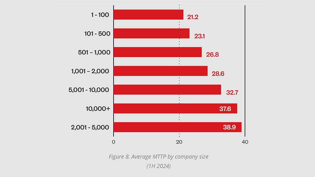 Οι μεγάλες επιχειρήσεις, με πάνω από 10.000 υπαλλήλους, κατέγραψαν τα υψηλότερα επίπεδα κινδύνου, κυρίως λόγω της πολυπλοκότητας της ασφάλειας στον μεγάλο αριθμό συσκευών και λογαριασμών που διαθέτουν. Η έκθεση αποδεικνύει ότι οι εταιρείες με μικρότερο αριθμό εργαζομένων τείνουν να διαχειρίζονται πιο αποτελεσματικά τους κινδύνους ασφαλείας, ενώ οι μεσαίες επιχειρήσεις (2.000–5.000 υπάλληλοι) αντιμετώπισαν δυσκολίες με έναν μέσο χρόνο επιδιόρθωσης (MTTP) 39 ημερών, δείχνοντας καθυστερήσεις στην αντιμετώπιση των ευάλωτων σημείων.