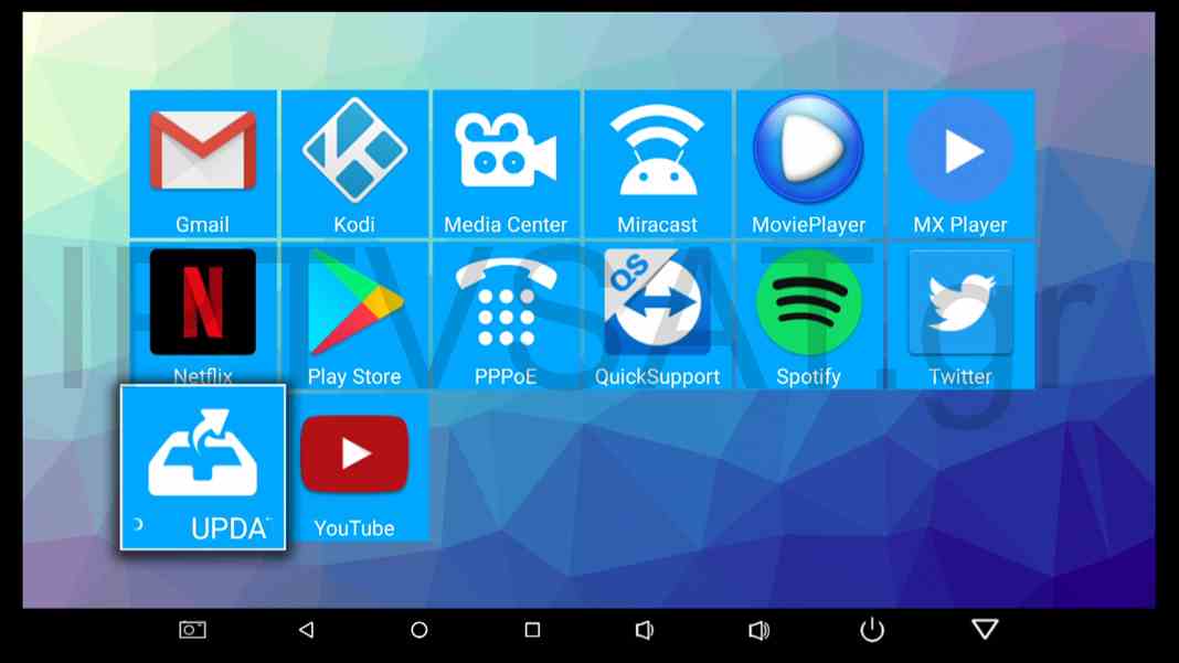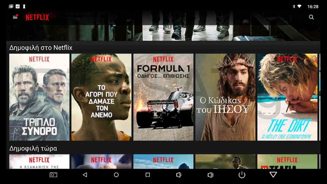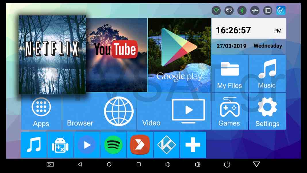 Σε μεγάλο μέγεθος στο αρχικό μενού, υπάρχουν οι εφαρμογές Netflix, Youtube και Google play, ενώ σε μικρότερο μέγεθος φαίνονται οι εφαρμογές My Files, Music, Apps, Browser, Video, Games και Settings.