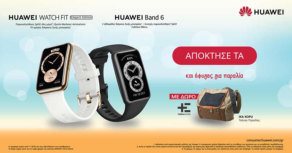 Φέτος το καλοκαίρι το απόλυτο τεχνολογικό gadget που λειτουργεί ταυτόχρονα και ως fashion αξεσουάρ ακούει στο όνομα HUAWEI Band 6 και συνοδεύεται από μια άχαστη καλοκαιρινή προσφορά! Έως και 30 Ιουνίου -και μέχρι εξαντλήσεως των αποθεμάτων- μπορεί να γίνει δικό σου μέσω του επίσημου δικτύου καταστημάτων της Huawei, με δώρο την τσάντα παραλίας καφέ χρώματος ΙΚΑ ΚΟPU της Terra Nation. Απόκτησέ τo και έφυγες για παραλία!