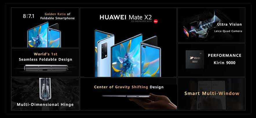 Το HUAWEI Mate X2 έχει βασιστεί σε ένα ολοκαίνουργιο σχέδιο με σκόπιμα μεταβαλλόμενο σημείο ισορροπίας, έτσι ώστε να λειτουργεί τέλεια είτε είναι διπλωμένο είτε όχι. Η αναδιπλούμενη  οθόνη είναι μία από τις μεγαλύτερες της αγοράς, προκειμένου η εμπειρία χρήσης να είναι άκρως ικανοποιητική και στις δύο εκδοχές. Σχεδιασμένο με ακρίβεια, το HUAWEI Mate X2 διπλώνεται τέλεια παίρνοντας τη μορφή μιας συμπαγούς συσκευής και ξεδιπλώνεται όμορφα σε μια επίπεδη οθόνη. Εξοπλισμένο με Ultra Vision Leica Quad Camera, ισχυρό στερεοφωνικό ηχοσύστημα δύο ηχείων και γρήγορο chipset Kirin 9000 5G, το HUAWEI Mate X2 αποτελεί υπόδειγμα συσκευής  τελευταίας τεχνολογίας.