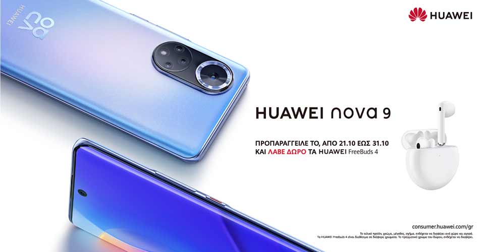 - Το HUAWEI nova 9 διατίθεται για προπαραγγελία στα καταστήματα Cosmote / ΓΕΡΜΑΝΟΣ, ΚΩΤΣΟΒΟΛΟΣ, ΠΛΑΙΣΙΟ, Public και MediaMarkt, από 21 Οκτωβρίου έως και 31 Οκτωβρίου, ή μέχρι εξαντλήσεως των αποθεμάτων, με δώρο τα HUAWEI FreeBuds 4.