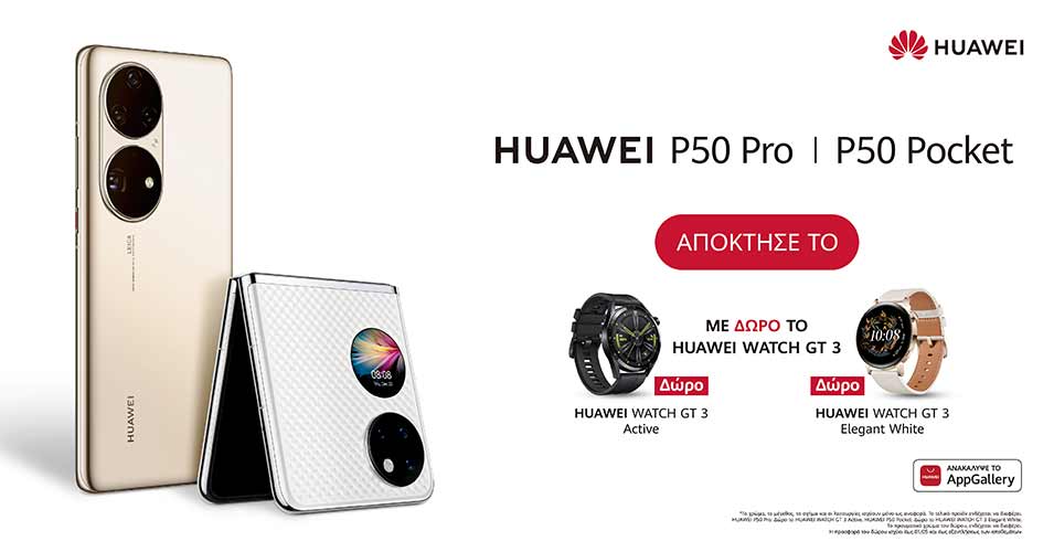 Τa HUAWEI P50 Pro και P50 Pocket είναι διαθέσιμα απ’ όλο  το επίσημο δίκτυο συνεργατών της εταιρείας και στο huaweistore.gr και διατίθενται με δώρο το Huawei Watch GT3 έως και τις 01/05/2022 ή μέχρι εξαντλήσεως των αποθεμάτων.