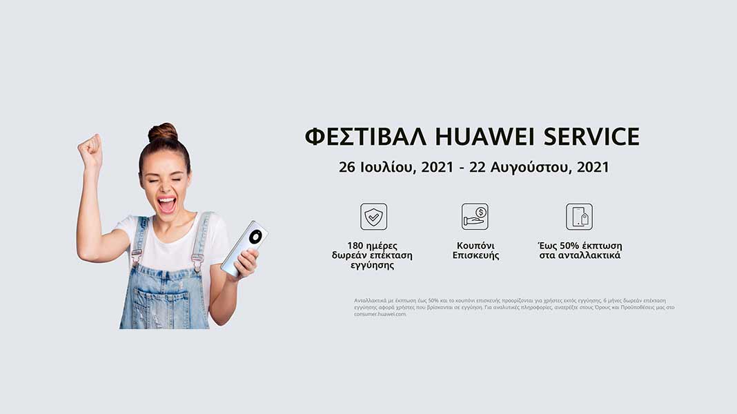 Η ικανοποίηση των πελατών αποτελεί κορυφαία προτεραιότητα της HUAWEI – όχι μόνο κατά την αγορά των προϊόντων αλλά και κατά τη διάρκεια της χρήσης. Η HUAWEI πιστεύει ότι η παράταση διάρκειας ζωής των smartphones, χάρη τόσο στα υλικά κορυφαίας ποιότητας που χρησιμοποιούνται στην κατασκευή προϊόντων όσο και στο επαγγελματικό σέρβις, ωφελεί τόσο τους καταναλωτές όσο και την εταιρεία. Έχοντας αυτό κατά νου, η HUAWEI παρουσιάζει το HUAWEI SERVICE FESTIVAL, μια πρωτοβουλία που έχει σχεδιαστεί για να επεκτείνει τη διάρκεια ζωής των HUAWEI smartphones. Οι πελάτες μπορούν να επισκεφθούν ένα εξουσιοδοτημένο κέντρο σέρβις ή ένα επιλεγμένο κατάστημα μεταξύ 26 Ιουλίου και 22 Αυγούστου για να επωφεληθούν από αυτήν την ειδική προσφορά.