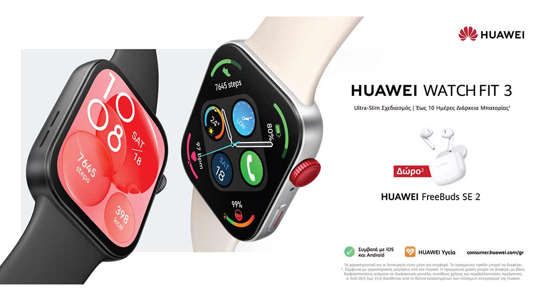 Το HUAWEI WATCH FIT 3 είναι διαθέσιμο στην ελληνική αγορά μέσω του δικτύου καταστημάτων των επίσημων συνεργατών της Huawei, με δώρο τα ακουστικά HUAWEI FreeBuds SE 2 έως και τις 31 Μαίου ή μέχρι εξαντλήσεως των αποθεμάτων.