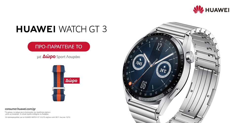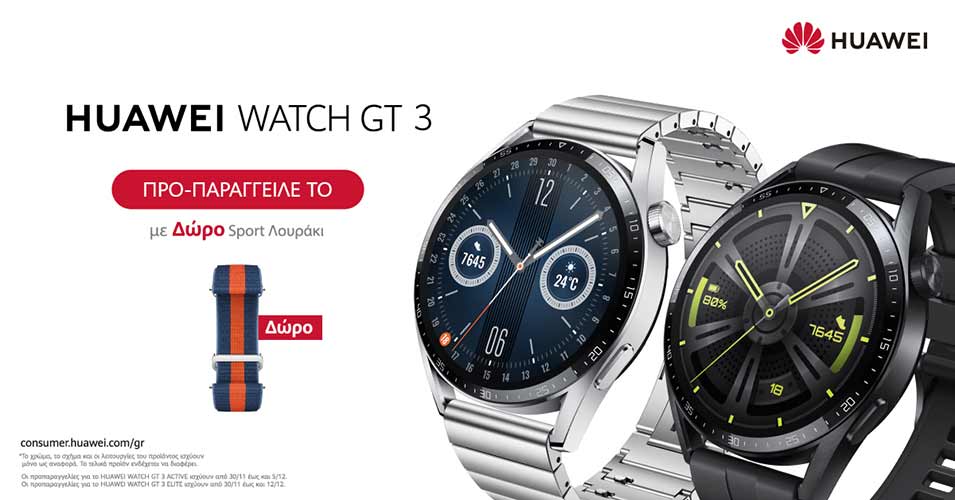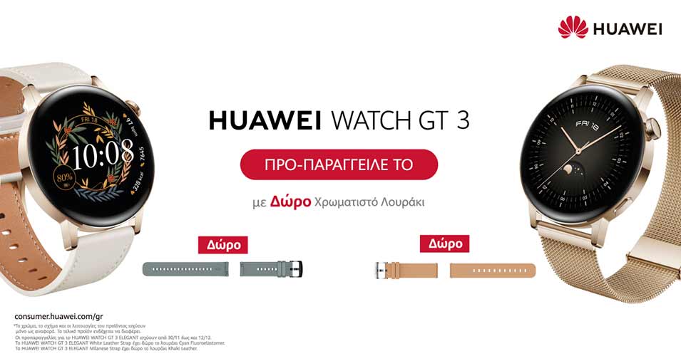 Τα HUAWEI Watch GT 3 Series θα είναι διαθέσιμα για προπαραγγελία σε όλο το επίσημο δίκτυο καταστημάτων της εταιρείας από τις 30 Νοεμβρίου με δώρο ένα επιπλέον λουράκι.