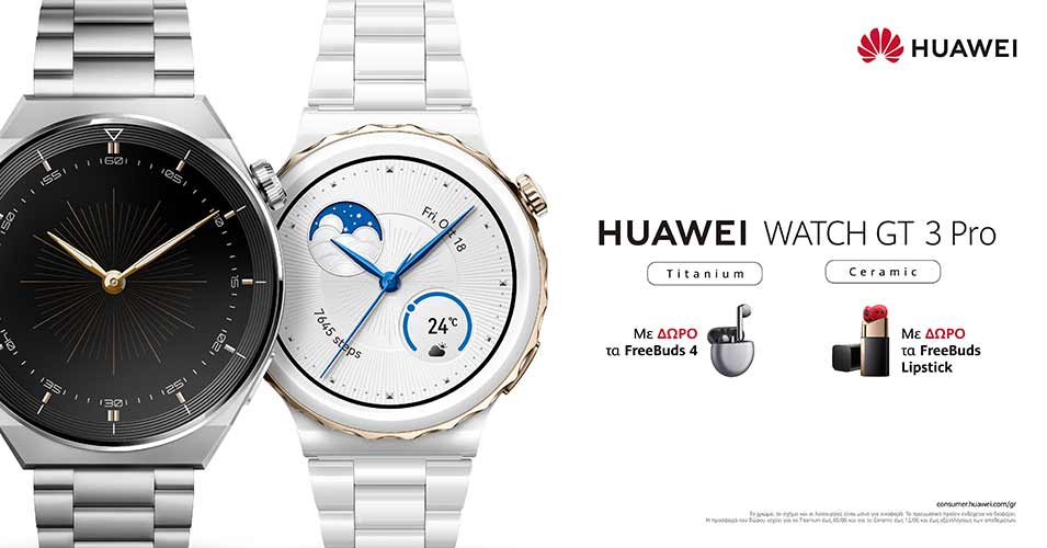 Το HUAWEI WATCH GT 3 Pro Titanium διατίθεται με δώρο το FreeBuds 4 και το HUAWEI WATCH GT 3 Pro Ceramic Edition είναι διαθέσιμο με δώρο το FreeBuds Lipstick από όλο το επίσημο δίκτυο συνεργατών της εταιρείας και στο huaweistore.gr.