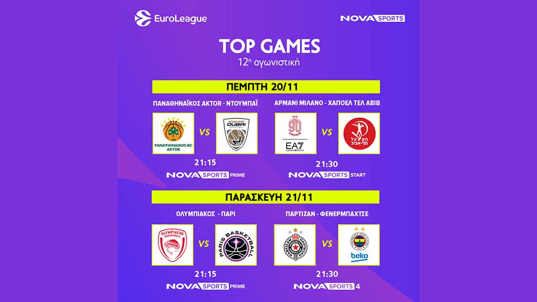 Η EuroLeague, η κορυφαία ευρωπαϊκή διασυλλογική διοργάνωση στο χώρο του μπάσκετ και μεγαλύτερη όλων των εποχών, ετοιμάζεται για τη συναρπαστική 12η αγωνιστική με τις εντός έδρας «μονομαχίες» των «αιωνίων»! Ο Παναθηναϊκός AKTOR υποδέχεται στο κλειστό του ΟΑΚΑ τη Ντουμπάι (20/11, 21:15) ενώ ο Ολυμπιακός θα αντιμετωπίσει στο ΣΕΦ την Παρί (21/11, 21:15). Από το υπόλοιπο πρόγραμμα ξεχωρίζουν οι αναμετρήσεις Ρεάλ Μαδρίτης – Ζάλγκιρις (20/11, 21:45), Παρτίζαν – Φενέρμπαχτσε (21/11, 21:30), Αναντολού Εφές – Μπαρτσελόνα (20/11, 19:30) και Αρμάνι Μιλάνο – Χάποελ Τελ Αβιβ (20/11, 21:30).