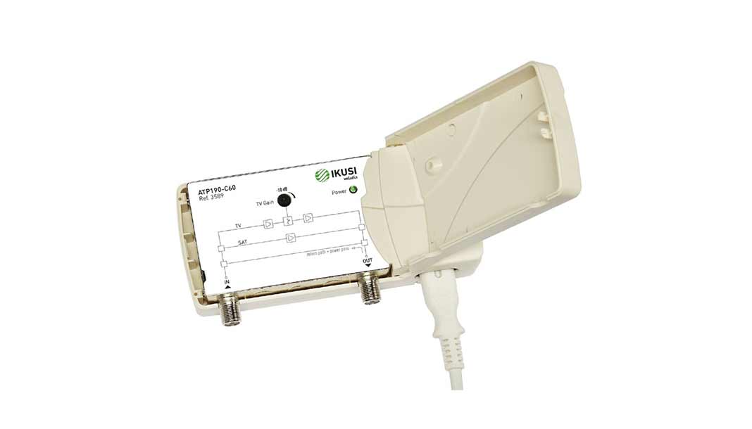 Ο ενισχυτής ATP190-C60 της IKUSI λειτουργεί σε ευρεία ζώνη (47-2400 MHz), διαθέτει ενσωματωμένο τροφοδοτικό (100~240 VAC, 50/60 Hz) και μπορεί να χρησιμοποιηθεί για την ενίσχυση των σημάτων TV & SAT σε μικρού μεγέθους εγκαταστάσεις.
