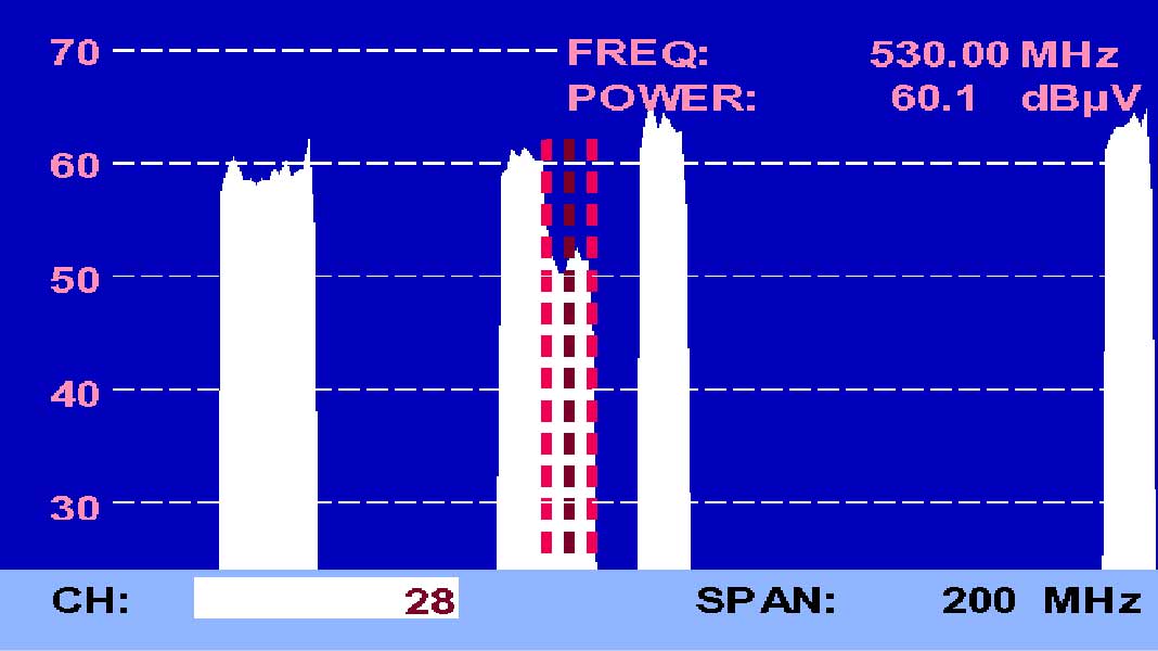 Σαν τελευταία δοκιμή, ρυθμίσαμε το φίλτρο της δεύτερης μονάδας στα 4 κανάλια και επιλέξαμε με μόνο ένα φίλτρο τα κανάλια 27,28 και 30. Αξίζει να σημειωθεί ότι το MER του καναλιού 28 χωρίς την ενίσχυση ήταν 27,7 dB, ενώ μετά την ενίσχυση και το φιλτράρισμα εύρους 4 καναλιών, ανήλθε στα 30,2 dB !