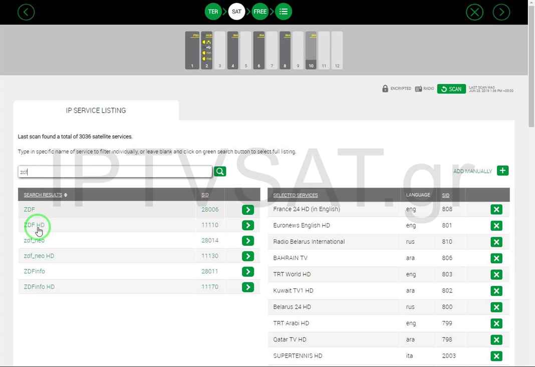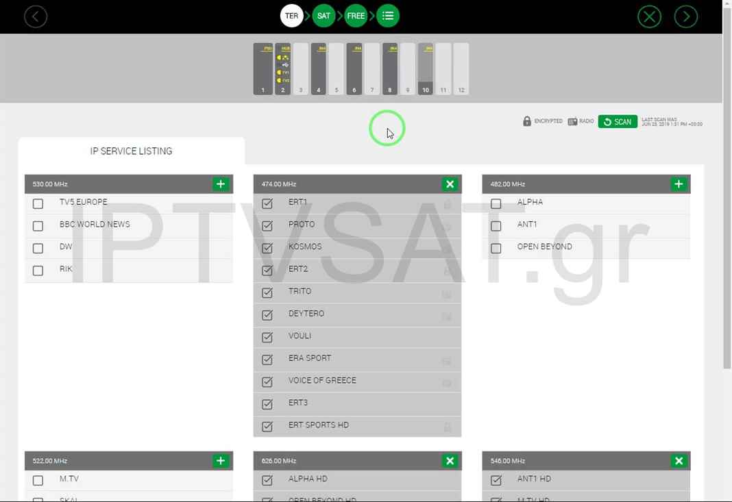 Με κλικ στο εικονίδιο TER και στη συνέχεια στο εικονίδιο Scan, έχουμε αυτόματη ανίχνευση των επίγειων καναλιών, ενώ αντίστοιχα με το εικονίδιο SAT και scan, έχουμε αυτόματη ανίχνευση των δορυφορικών καναλιών, ανάλογα με τους δορυφόρους που λαμβάνουμε και με τις πολώσεις που έχουμε τροφοδοτήσει από τα Quattro LNB που χρησιμοποιούμε.