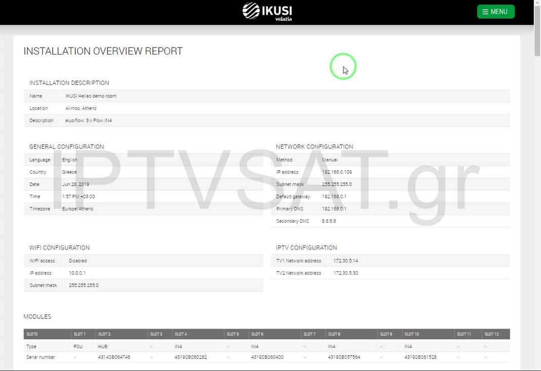 Στην διαδρομή STATUS->OVERVIEW εμφανίζεται η σελίδα INSTALLATION OVERVIEW REPORT, η οποία μας δίνει τη συνολική εικόνα της εκάστοτε στιγμής του headend, όπως περιγραφή της εγκατάστασης, το γενικό configuration, τη ρύθμιση του τοπικού WiFi Access Point, το βασικό δίκτυο πρόσβασης ελέγχου, καθώς και τη ρύθμιση δικτύου iptv, δηλαδή κυρίως ποιες IP χρησιμοποιούμε.