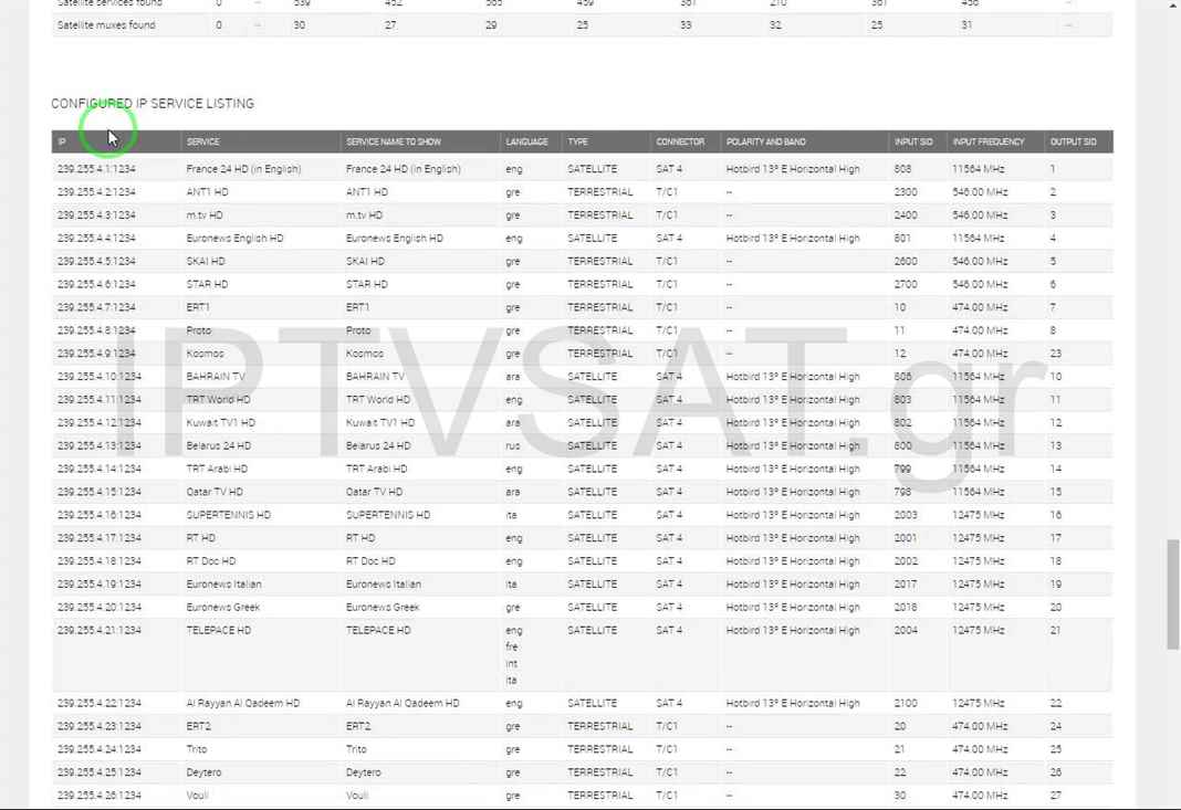 Παρακάτω στο CONFIGURED IP SERVICE LISTING, πληροφορούμαστε σε ποια IP είναι το κάθε κανάλι, το όνομα του καναλιού όπως έρχεται από τον δορυφόρο (SERVICE), αλλά και το όνομα που του δίνουμε εμείς εάν θέλουμε να το αλλάξουμε (SERVICE NAME TO SHOW), σε ποια ή ποιες γλώσσες λειτουργεί, σε ποιο δορυφόρο βρίσκεται, το SID εισόδου αλλά και το SID στη συχνότητα εξόδου. Ο συγκεκριμένος πίνακας είναι πολύ χρήσιμος, καθώς ο τεχνικός μπορεί να δώσει στον πελάτη ένα πλήρες report με τα κανάλια που χρησιμοποιούνται.