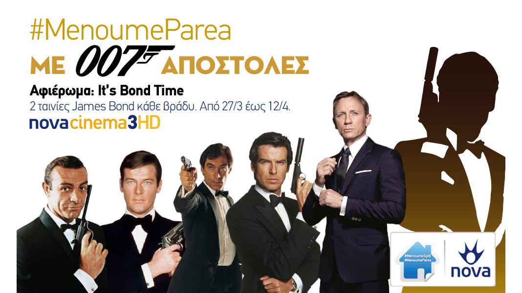 Από την Παρασκευή 27 Μαρτίου και κάθε βράδυ από τις 21:00 στο Novacinema3HD, «It’s bond time!», με δύο ταινίες του θρυλικού πράκτορα που αγαπήθηκε όσο κανένας άλλος. Από την πρώτη ταινία του 1962 «Dr. No», με τον μοναδικό σκωτσέζο Sean Connery, μέχρι και τις τέσσερις ταινίες του Daniel Craig: «Casino Royal», «Quantum of Solace», «Skyfall» και «Spectre». Επιπλέον, το Σαββατοκύριακο 11 & 12 Απριλίου θα πραγματοποιηθεί ένας σούπερ 24ωρος μαραθώνιος με μόνο James Bond back to back!