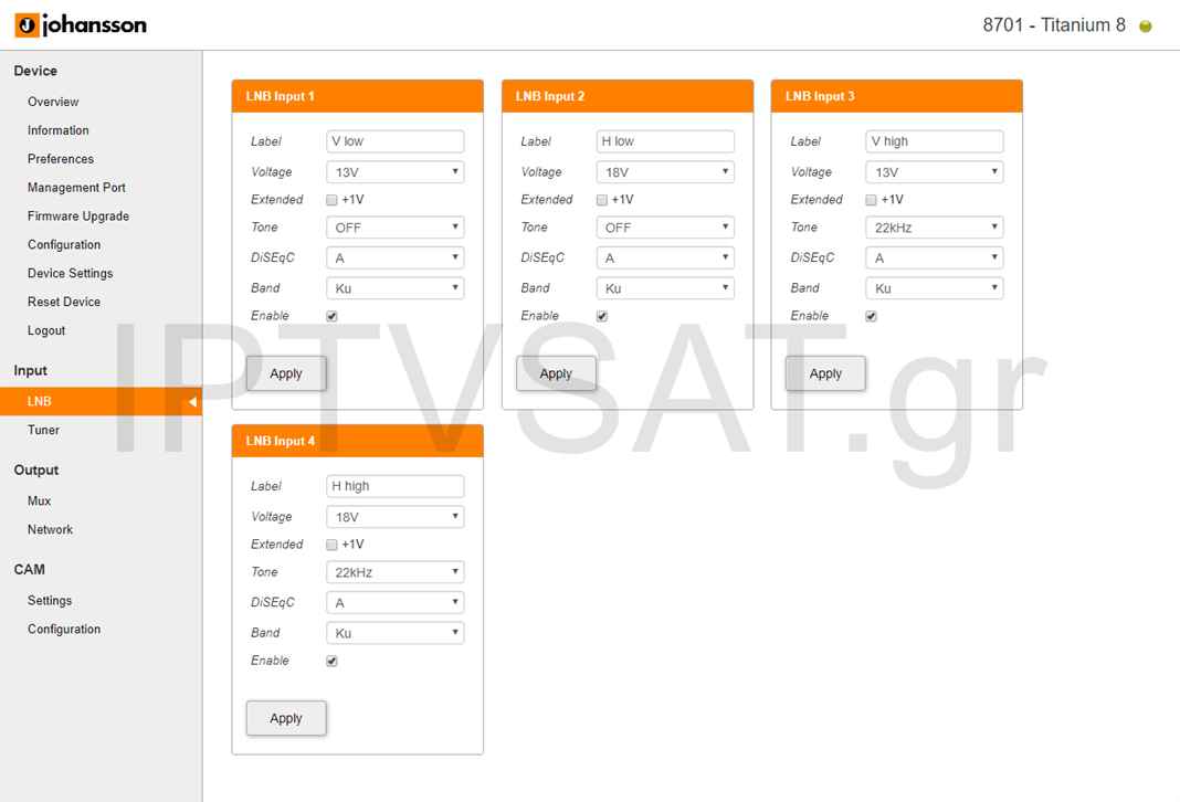 Η επιλογή Input περιλαμβάνει τις ρυθμίσεις LNB και Tuner, με τις οποίες σετάρουμε πλήρως ποια κανάλια θα λαμβάνουμε. Στις ρυθμίσεις LNB, εισάγουμε όλες τις παραμέτρους για κάθε LNB, όπως τάση πόλωσης 13/18V, +1V, 22 KHz, DiSEqC A,B,C,D, Ku/C και τέλος δεν θα πρέπει να ξεχάσουμε να τικάρουμε το Enable. Οι εν λόγω επιλογές, σημαίνουν ότι μπορούμε να χρησιμοποιήσουμε οποιοδήποτε LNB από τα γνωστά είδη, όπως πχ universal Quad, quattro, single universal ή και multiswitch, ενώ σαφώς μπορούμε να χρησιμοποιήσουμε και απλά universal από διαφορετικούς δορυφόρους.