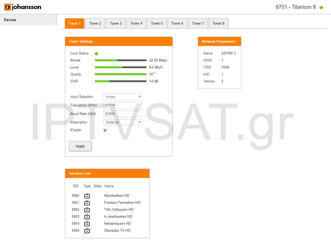Εφόσον ολοκληρώσουμε τη ρύθμιση LNB, μπορούμε να συνεχίσουμε με τη ρύθμιση των 8 tuners, σύμφωνα με τις επιλογές LNB που έχουμε κάνει. Έτσι για παράδειγμα, εάν χρησιμοποιήσουμε ένα quad LNB, τότε στα 8 tuners, μπορούμε να επιλέξουμε οποιαδήποτε συχνότητα από τον δορυφόρο που λαμβάνουμε. Όταν εισαγάγουμε τα στοιχεία ενός transponder και κάνουμε κλικ στο Apply, θα εμφανιστούν άμεσα οι μπάρες σήματος με τις παραμέτρους Bitrate, Level, Quality, SNR, τα στοιχεία δικτύου, όπως name, ONID, TSID, NID και η πλήρης λίστα καναλιών του transponder με τα SID και εικονίδιο ελεύθερου ή κωδικοποιημένου καναλιού (οθόνη/λουκέτο).