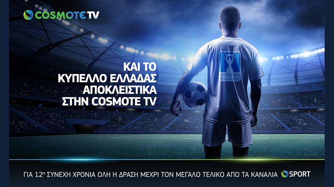 Η COSMOTE TV εξασφάλισε τα αποκλειστικά δικαιώματα μετάδοσης του Κυπέλλου Ελλάδας ποδοσφαίρου, του θεσμού των μεγάλων εκπλήξεων. Για δωδέκατη συνεχή χρονιά, τα κανάλια COSMOTE SPORT θα μεταφέρουν την αγωνιστική δράση, από την 5η φάση μέχρι και τον μεγάλο τελικό. Το Κύπελλο Ελλάδας έρχεται να προστεθεί στο ήδη πλούσιο αθλητικό πρόγραμμα της COSMOTE TV, που περιλαμβάνει περισσότερες από 60 κορυφαίες διοργανώσεις σε ποδόσφαιρο, μπάσκετ, τένις, μηχανοκίνητα και άλλα δημοφιλή αθλήματα και πάνω από 8.000 ώρες live μεταδόσεων.