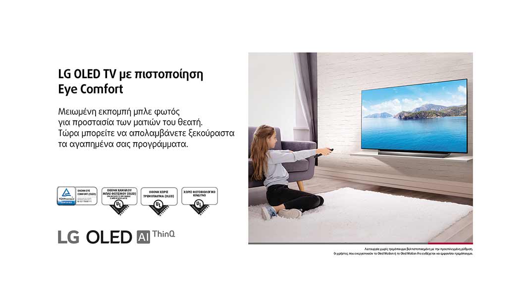 Οι OLED τηλεοράσεις της LG Electronics (LG) προσφέρουν ανώτερη ποιότητα εικόνας, χωρίς χρωματικές αλλοιώσεις και αυτό αποδεικνύεται από τα προηγμένα χαρακτηριστικά τους και την πιστοποίηση ασφαλείας που έχουν λάβει όσον αφορά στην προστασία της όρασης. Με την ενσωματωμένη λειτουργία Eye Comfort, οι χρήστες απολαμβάνουν πιο άνετη και ξεκούραστη εμπειρία θέασης.