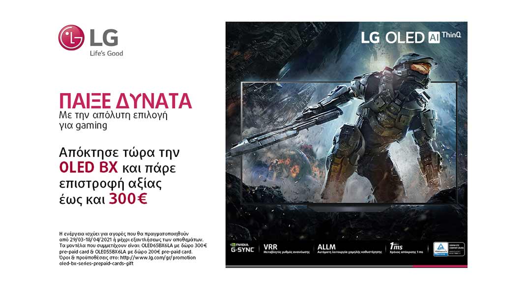 Συγκεκριμένα, με κάθε αγορά ενός μοντέλου τηλεόρασης OLED65BX6LA από τις 29/03 έως και τις 18/04/2021[1], η LG προσφέρει μια pre-paid card αξίας 300€, ενώ επιλέγοντας μια OLED55BX6LA, δίνεται δωροκάρτα αξίας 200€.