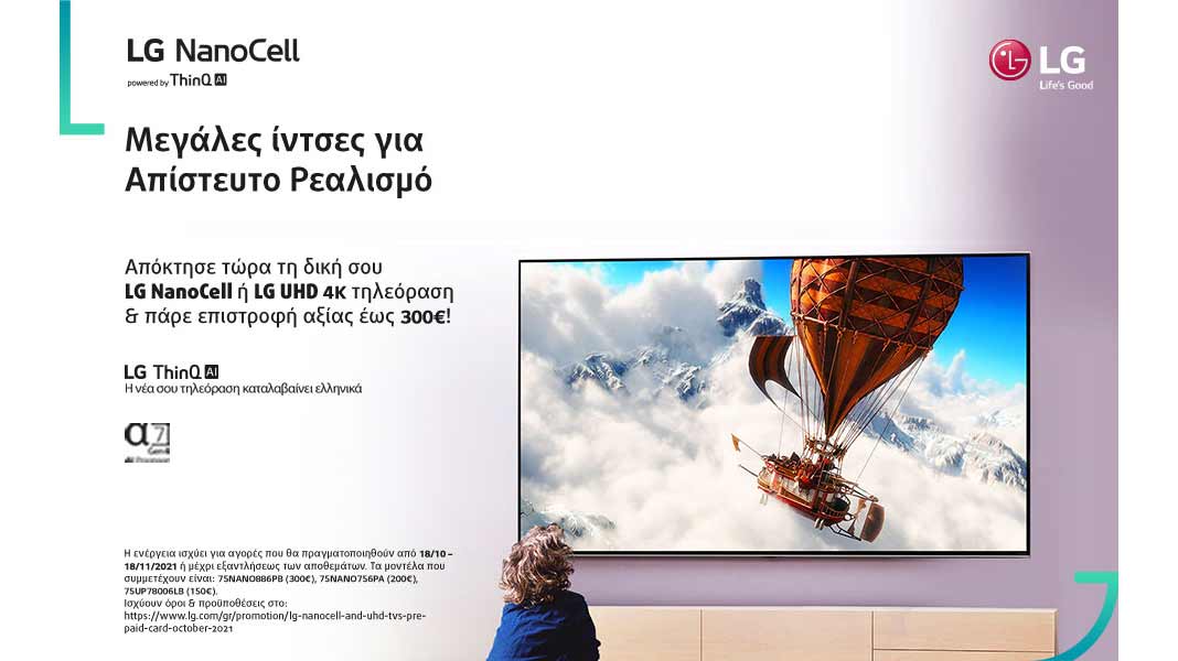 Η LG Electronics (LG) προσκαλεί τους καταναλωτές να απολαύσουν το αγαπημένο τους τηλεοπτικό περιεχόμενο και ρεαλιστικές εικόνες σε μεγάλες ίντσες μέσα από τις LG NanoCell και UHD τηλεοράσεις, που περιλαμβάνονται στη νέα προωθητική της ενέργεια. Συγκεκριμένα, αγοράζοντας μία LG NanoCell ή LG UHD 4K τηλεόραση από τις 18 Οκτωβρίου έως τις 18 Νοεμβρίου[1], η εταιρεία προσφέρει μια prepaid card αξίας έως και 300€.