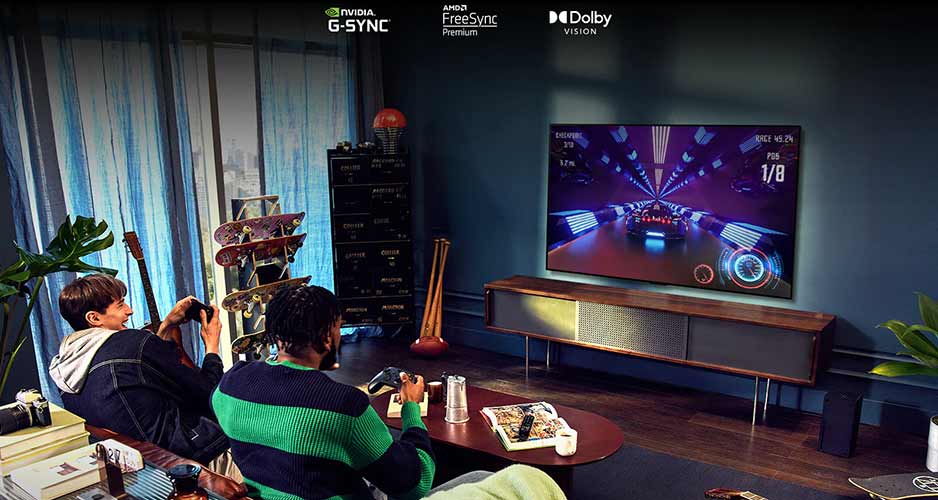 Με το Dolby Vision Gaming[1] 4K στα 100 Hz, χρόνο απόκρισης 0,1 ms[2] για πιο καθαρά γραφικά, συμβατότητα NVIDIA G-Sync[3], AMD FreeSync Premium[4] και υποστήριξη VRR[5] που συμβαδίζει με τις αλλαγές στον ρυθμό καρέ για να μειωθεί η αλλοίωση της εικόνας, η νέα τηλεόραση προσφέρει ακόμα πιο φρενήρη δράση, με καθαρή και ομαλή απεικόνιση και εύρος ζώνης 48 Gbps για πλούσια γραφικά χωρίς καθυστερήσεις.