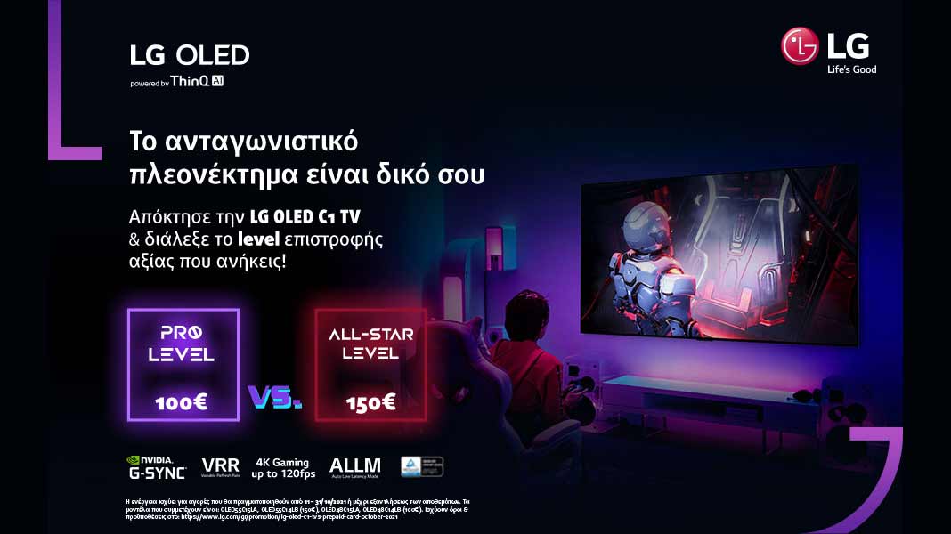 Η LG Electronics (LG) δίνει το προβάδισμα στους gamers για τη νίκη μέσα από τις LG OLED C1 τηλεοράσεις που περιλαμβάνονται στη νέα προωθητική της ενέργεια. Συγκεκριμένα, αγοράζοντας μία LG OLED C1 τηλεόραση από τις 11 έως τις 31 Οκτωβρίου[1], η εταιρεία προσφέρει μια prepaid card αξίας έως και 150€.