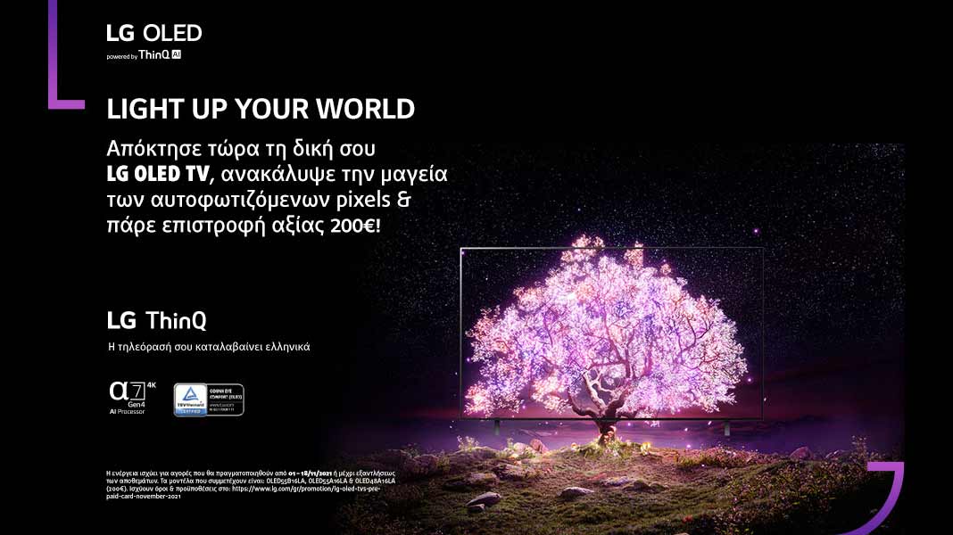 Όροι και προϋποθέσεις της προωθητικής ενέργειας στον ακόλουθο σύνδεσμο: https://www.lg.com/gr/promotion/lg-oled-tvs-prepaid-card-november-2021.