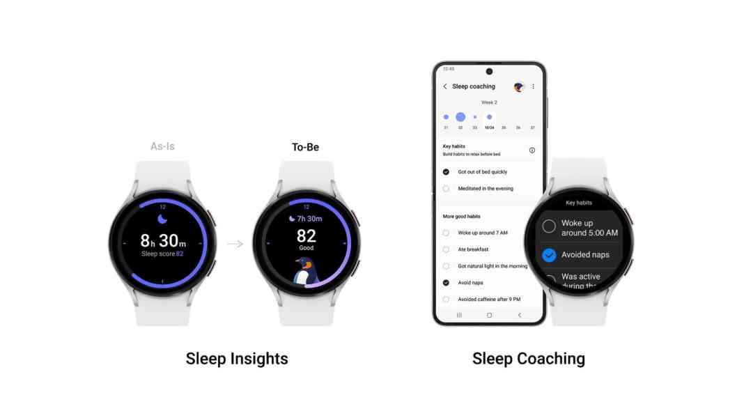 Η νέα διεπαφή χρήστη Sleep Insights εμφανίζει τη βαθμολογία ύπνου του χρήστη, παρέχοντας μια πιο ξεκάθαρη εικόνα για τον ύπνο το προηγούμενο βράδυ, ενώ περιλαμβάνει και σχετικές μετρήσεις όπως φάσεις ύπνου, ώρες ροχαλητού και επίπεδα οξυγόνου στο αίμα. Επιπλέον, το Sleep Coaching — προσαρμοσμένο σε οκτώ διαφορετικούς τύπους ύπνου[2] — γίνεται επίσης πλήρως προσβάσιμο απευθείας στο Galaxy Watch καθώς και στο συνδεδεμένο smartphone, προσφέροντας έναν πιο βολικό τρόπο και παρακινώντας τους χρήστες να παρακολουθούν τις συνήθειες τους οποιαδήποτε στιγμή και σε οποιοδήποτε μέρος.