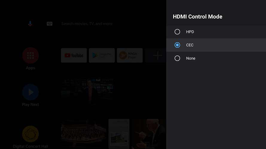 Το HDMI CEC είναι ενεργοποιημένο από προεπιλογή. Η έκδοση Android 9.0 έχει ενεργοποιημένη από προεπιλογή τη δυνατότητα HDMI CEC. Με την συγκεκριμένη δυνατότητα, το τηλεχειριστήριο της τηλεόρασης μπορεί να χρησιμοποιηθεί για να ενεργοποιείτε τον αποκωδικοποιητή και να τον ελέγχετε, όπως πχ. για εναλλαγή καναλιών. Τα παλαιότερα μοντέλα τηλεοράσεων διαθέτουν την επιλογή HDMI HPD, με την οποία το MAG425A θα αφήσει αυτόματα τη λειτουργία αναμονής μόλις ενεργοποιηθεί η τηλεόραση.