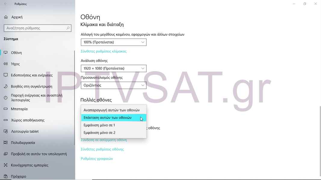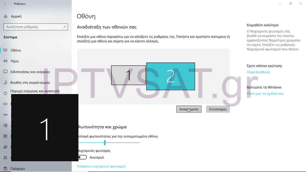 Στην επιλογή Οθόνη και κάνοντας κλικ στο Αναγνώριση, θα εμφανιστεί το νούμερο 1 στην βασική οθόνη σας και το νούμερο 2 στη δεύτερη οθόνη σας, προκειμένου να σιγουρευτείτε για την αντιστοίχιση των οθονών. Τα συγκεκριμένα νούμερα μπορούν να αντιστραφούν κατ’ επιλογή.