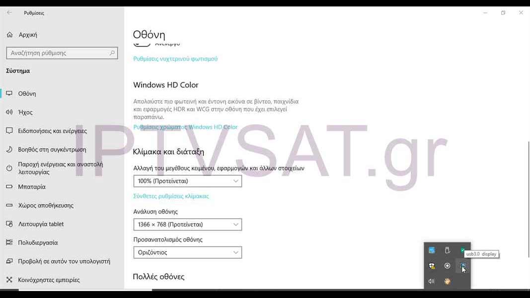 Στην ομάδα εικονιδίων κάτω δεξιά της οθόνης σας, θα δείτε το εικονίδιο για τις ρυθμίσεις του προσαρμογέα (usb3.0 display). Στη τελευταία ρύθμιση «Προσαρμογή σε TV» και στην επιλογή «Πολλές οθόνες», θα μπορείτε να επιλέξετε: