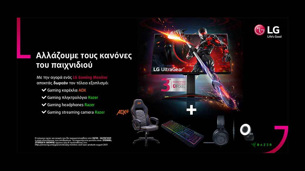 Το επαγγελματικό τμήμα Business Solutions της LG Electronics (LG) αλλάζει τους κανόνες στο gaming μέσα από τη νέα της προωθητική ενέργεια, προσφέροντας σε όλους τους καταναλωτές μοναδικά αξεσουάρ gaming με την αγορά ενός LG monitor. Η ενέργεια ισχύει για αγορές που θα πραγματοποιηθούν από τις 30 Αυγούστου έως τις 26 Σεπτεμβρίου 2021[1].