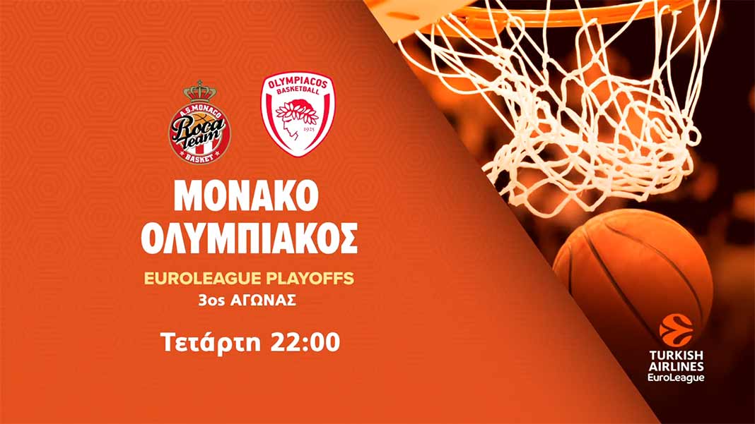 22:00 EuroLeague Play offs 3ος αγώνας: Μονακό-Ολυμπιακός, Novasports Prime και ηχητικά στο Web TV του Novasports.gr σε περιγραφή του Χρήστου Καούρη και σχόλιο του Δημήτρη Καρύδα