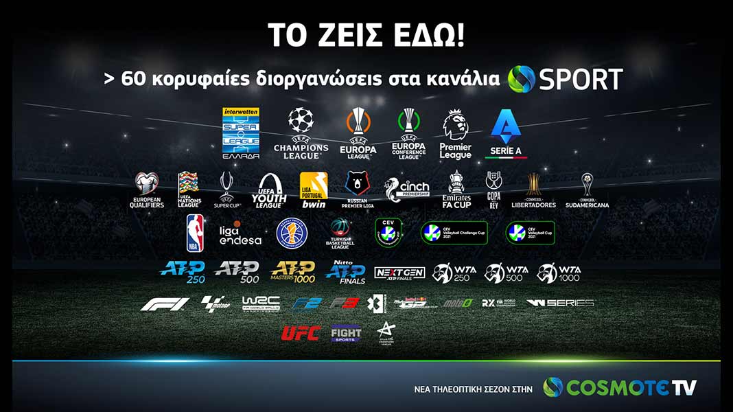 Το πιο πλούσιο αθλητικό θέαμα θα προσφέρει η COSMOTE TV στους συνδρομητές της, από τη νέα τηλεοπτική σεζόν. Περισσότερες από 60 κορυφαίες διοργανώσεις σε ποδόσφαιρο, μπάσκετ, τένις, μηχανοκίνητα και άλλα δημοφιλή αθλήματα, θα προσφέρουν αμέτρητες συγκινήσεις, μέσα από ένα πρόγραμμα που περιλαμβάνει πάνω από 8.000 ώρες live μεταδόσεων. Κριστιάνο Ρονάλντο, Μοχάμεντ Σαλάχ, Γιάννης Αντετοκούνμπο, Λεμπρόν Τζέιμς, Στέφανος Τσιτσιπάς, Μαρία Σάκκαρη, Λιούις Χάμιλτον, Μαξ Φερστάπεν, Σεμπαστιάν Οζιέ, Έλφιν Έβανς, Φάμπιο Κουαρταραρό, Γιόχαν Ζάρκο είναι έτοιμοι για μεγάλες μάχες και η δημοσιογραφική ομάδα των καναλιών COSMOTE SPORT θα βρίσκεται σε κάθε γήπεδο και σε κάθε πίστα για να τις μεταδώσει.