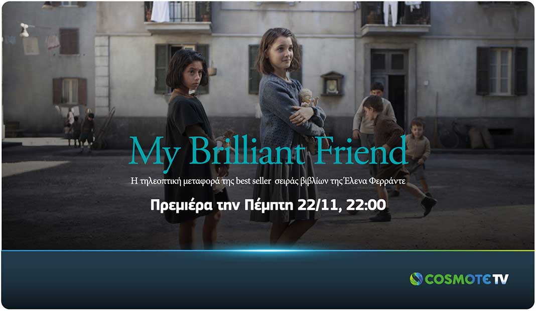 Η τηλεοπτική μεταφορά του εκδοτικού φαινομένου & best selling «τετραλογίας της Νάπολης» που αγαπήθηκε ιδιαίτερα και στην Ελλάδα, της Ιταλίδας συγγραφέα Έλενα Φερράντε, My Brilliant Friend, κάνει πρεμιέρα αποκλειστικά στην COSMOTE TV την Πέμπτη 22/11, στις 22.00 (COSMOTE CINEMA 4HD). Η Ιταλική σειρά, που πρωτοπαρουσιάστηκε στο φετινό φεστιβάλ Βενετίας, θα προβάλλεται κάθε Πέμπτη βράδυ στις 22.00 και αμέσως μετά θα είναι διαθέσιμη on demand στην υπηρεσία COSMOTE TV PLUS.