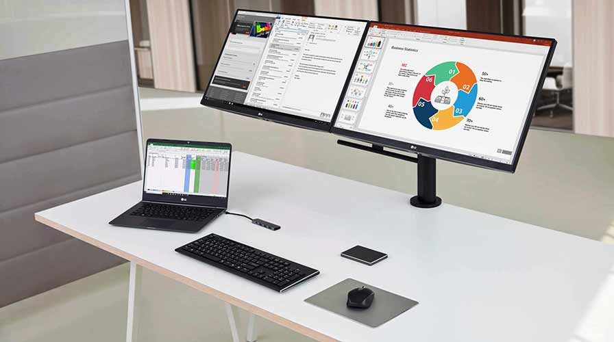 Με ένα μεγάλο εύρος περιστροφής, οι συγκεκριμένες οθόνες μπορούν να ανταποκριθούν στις ανάγκες κάθε χρήστη. Διαθέσιμη σε 27 ίντσες, η LG Ergo Dual οθόνη μπορεί να συνδεθεί και με μια άλλη συμβατή οθόνη της LG και να τοποθετηθούν αναλόγως σε οριζόντιο προσανατολισμό, ή κάθετα σε μορφή portrait, να τοποθετηθεί η μία οριζόντια και η άλλη κάθετα ή ακόμα και να στοιβάζονται κάθετα και οι δύο προς αντίθετες κατευθύνσεις. Η 32 ιντσών LG Ergo Single οθόνη είναι ιδανική για χρήστες που προτιμούν ένα μεγάλο, απρόσκοπτο χώρο εργασίας.