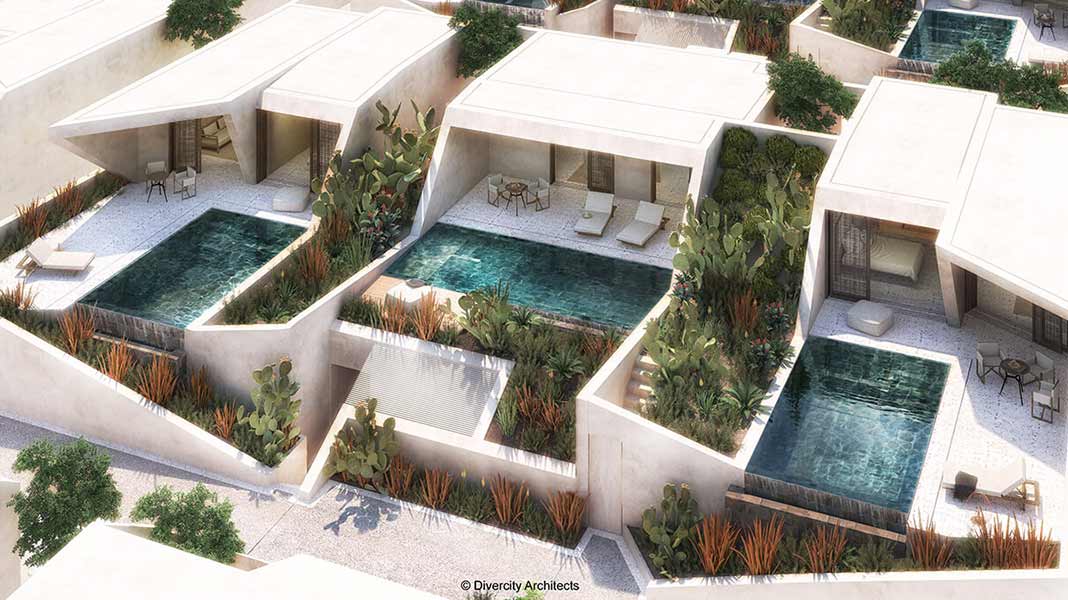 Το resort, το οποίο αντλεί έμπνευση από τις γεωμετρικές φόρμες της αρχιτεκτονικής του νησιού, έχει δυναμικότητα 121 δωματίων, τα περισσότερα εκ των οποίων διαθέτουν ιδιωτικές πισίνες, ένα μοναδικό spa με εσωτερική και εξωτερική πισίνα, και δύο εστιατόρια.