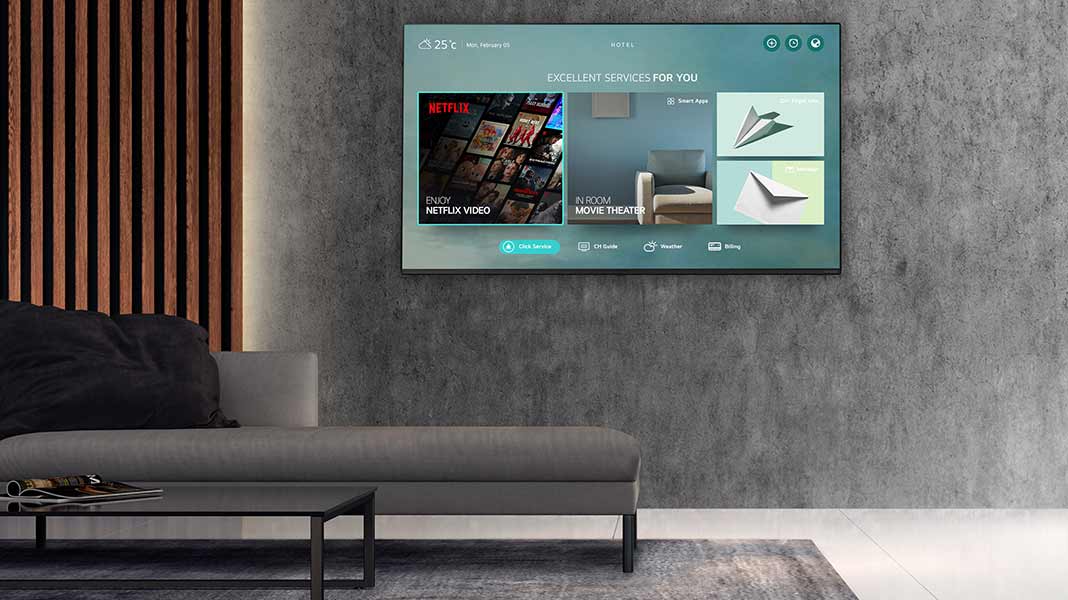 Χάρη στη στενή συνεργασία μεταξύ της LG και του Netflix, περισσότερα ξενοδοχεία σε όλο τον κόσμο θα μπορούν πλέον να προσφέρουν την παγκοσμίως δημοφιλή over-the-top (OTT) υπηρεσία streaming σε ξενοδοχειακές LG τηλεοράσεις με webOS 5.0 και Pro:Centric Direct 4.5. Επιπλέον, για τη διασφάλιση της άψογης λειτουργίας της εφαρμογής Netflix στο ευέλικτο σύστημά της, η LG έχει αναπτύξει μια βελτιωμένη διαδικασία εγκατάστασης που καθιστά ταχύτερη και ευκολότερη τη συνεργασία μεταξύ των ξενοδοχείων και των system integrators.