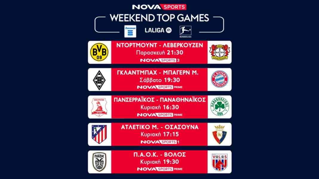 Η συναρπαστική LaLiga στην Ισπανία συνεχίζεται στα κανάλια Novasports με τους αγώνες Σεβίλλη – Βαλένθια (11/1, 22:00) και Ατλέτικο Μαδρίτης – Οσασούνα (12/1, 17:15) να ξεχωρίζουν από το πρόγραμμα, καθώς η Μπαρτσελόνα και η Ρεάλ Μαδρίτης έχουν ήδη παίξει για την 19η αγωνιστική. Την ίδια στιγμή η θεαματική Bundesliga στη Γερμανία περιλαμβάνει το ντέρμπι Ντόρτμουντ – Λεβερκούζεν (10/1, 21:30) και τον αγώνα Γκλάντμπαχ – Μπάγερν (11/1, 19:30) που θα μεταδοθούν στα κανάλια Novasports. Η εκπομπή «Matchday Live» με τον Ηλία Βλάχο μεταφέρει λεπτό προς λεπτό όλη την αθλητική δραστηριότητα από τη Bundesliga αλλά και από τα άλλα πρωταθλήματα που είναι εκείνη την ώρα σε εξέλιξη.