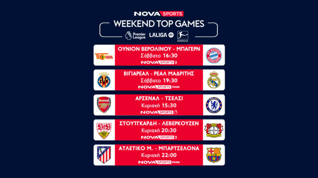 Η συναρπαστική La Liga στην Ισπανία συνεχίζεται στα κανάλια Novasports με το ντέρμπι Ατλέτικο Μαδρίτης – Μπαρτσελόνα (16/3, 22:00) και Βιγιαρεάλ – Ρεάλ Μαδρίτης (15/3, 19:30). Η θεαματική Bundesliga καθηλώνει στα κανάλια Novasports και το πρόγραμμα αυτής της εβδομάδας περιλαμβάνει τους αγώνες Ουνιόν Βερολίνου – Μπάγερν Μονάχου (15/3, 16:30), Λειψία – Ντόρτμουντ (15/3, 19:30) και Στουτγκάρδη – Μπάγερ Λεβερκούζεν (16/3, 20:30). Η εκπομπή «Matchday Live» με τον Ηλία Βλάχο μεταφέρει λεπτό προς λεπτό όλη την αθλητική δραστηριότητα από τη Bundesliga αλλά και από τα άλλα πρωταθλήματα που είναι εκείνη την ώρα σε εξέλιξη.