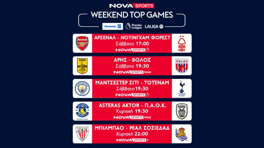 Στην Premier League, το κορυφαίο πρωτάθλημα στον κόσμο με τους 380 αγώνες LIVE και με τη φωνή του Χρήστου Σωτηρακόπουλου,, ξεχωρίζει στα κανάλια Novasports, το ντέρμπι Μάντσεστερ Σίτι – Τότεναμ (23/11, 19:30) καθώς και οι αγώνες Άρσεναλ-Νότιγχαμ Φόρεστ (23/11, 17:00), Σαουθάμπτον-Λίβερπουλ (24/11, 16:00) και Ίπσουιτς-Μάντσεστερ Γιουνάιτεντ (24/11, 18:30). Η Premier League θα πλαισιωθεί με τις εκπομπές «Premier League Kick Off» και «Premier League The Show» με τον Άγγελο Στυλιάδη.