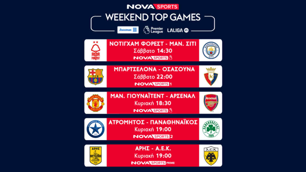 Η Premier League, το κορυφαίο πρωτάθλημα στον κόσμο και με τη φωνή του Χρήστου Σωτηρακόπουλου, συνεχίζεται με αμείωτο ενδιαφέρον και το ντέρμπι Μάντσεστερ Γιουνάιτεντ – Άρσεναλ (9/3, 18:30) καθώς και τους αγώνες Νότιγχαμ Φόρεστ – Μάντσεστερ Σίτι (8/3, 14:30), Λίβερπουλ – Σαουθάμπτον (8/3, 17:00) που θα καλυφθούν από τα κανάλια Novasports. Η αγωνιστική θα πλαισιωθεί με την εκπομπή «Matchday Live» με τον Ηλία Βλάχο και «Premier League The Show με τον Γιώργο Σαμαρά και τον Άγγελο Στυλιάδη.