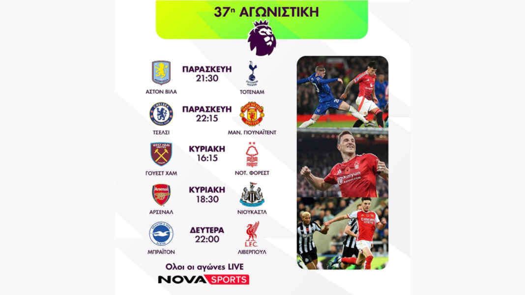 Η Premier League, το κορυφαίο πρωτάθλημα στον κόσμο και με τη φωνή του Χρήστου Σωτηρακόπουλου παίζει μπάλα στο γήπεδο των καναλιών Novasports και οι συνδρομητές θα απολαύσουν την 37η αγωνιστική η οποία θα ολοκληρωθεί την Τρίτη 20/5 με τα παιχνίδια Μάντσεστερ Σίτι-Μπόρνμουθ και Κρίσταλ Πάλας-Γουλβς. Η Μάντσεστερ Σίτι και η Κρίσταλ Πάλας αγωνίζονται στον τελικό του Κυπέλλου Αγγλίας το Σάββατο 17/5 για αυτό και οι εν λόγω αγώνες μεταφέρθηκαν στις 20/5. Από το πρόγραμμα ξεχωρίζουν οι αγώνες Τσέλσι – Μάντσεστερ Γιουνάιτεντ (16/5, 22:15), Άστον Βίλα – Τότεναμ (16/5, 21:30), Γουέστ Χαμ – Νότιγχαμ Φόρεστ (18/5, 16:15), Άρσεναλ – Νιουκάστλ (18/5, 18:30) και Μπράιτον – Λίβερπουλ (19/5, 22:00). Οι αγώνες θα πλαισιωθούν και από τις εκπομπές «Premier League Kick» Off και «Premier League The Show» με τους Άγγελο Στυλιάδη και Γιώργο Σαμαρά.