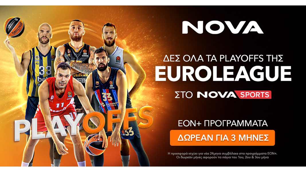 Η EuroLeague, η κορυφαία ευρωπαϊκή διασυλλογική διοργάνωση στο χώρο του μπάσκετ, την οποία οι συνδρομητές του Novasports θα απολαμβάνουν αποκλειστικά και για τις επόμενες πέντε (5) σεζόν, κάνει τζάμπολ στα Playoffs (25/4 έως 9-10/5) με τη συμμετοχή top ευρωπαϊκών ομάδων όπως οι Ολυμπιακός, Μπαρτσελόνα, Ρεάλ Μαδρίτης, Μονακό, Μακάμπι Τελ Αβίβ, Παρτίζαν Βελιγραδίου, Ζαλγκίρις Κάουνας και Φενέρμπαχτσε.