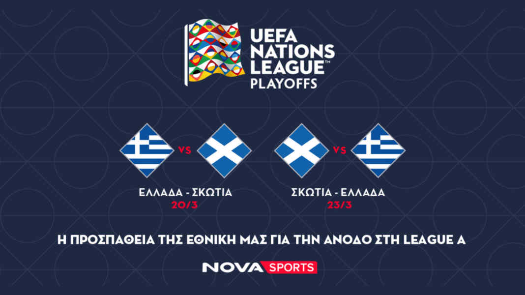 Την άνοδό της στην ελίτ κατηγορία του UEFA Nations League θα διεκδικήσει η Εθνική μας ομάδα ποδοσφαίρου με τους αγώνες Playoffs κόντρα στην Σκωτία. Η Ελλάδα κατέκτησε τη δεύτερη θέση στη φάση των ομίλων πίσω από την Αγγλία και θέλει να ανέβει στην κορυφαία κατηγορία του θεσμού (League A). Ο πρώτος αγώνας για το συγκρότημα του Ιβάν Γιοβάνοβιτς, θα διεξαχθεί την Πέμπτη 20/3 (21:45, Novasports Prime) στο στάδιο “Γ. Καραϊσκάκης” ενώ ο επαναληπτικός θα γίνει στην Σκωτία την Κυριακή 23/3 (19:00, Novasports Prime). Και οι δύο αγώνες θα είναι σε περιγραφή του Χρήστου Σωτηρακόπουλου και σχόλιο του Ντέμη Νικολαϊδη. Στο ρεπορτάζ της Εθνικής θα είναι ο Αποστόλης Λάμπος ενώ η εκπομπή UEFA Nations League Tonight με τον Νίκο Τζουάννη θα πλαισιώσει όλους τους αγώνες των Play Offs: Ελλάδα-Σκωτία, Τουρκία-Ουγγαρία, Αρμενία-Γεωργία, Ουκρανία-Βέλγιο, Αυστρία-Σερβία, Κόσοβο-Ισλανδία, Βουλγαρία-Ιρλανδία και Σλοβακία-Σλοβενία.